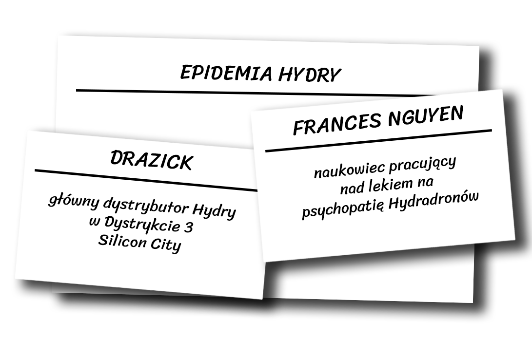 Silicon City zawiera wszystko, czego będziecie potrzebować do rozpoczęcia pierwszej sesji. Zanim zaczniecie, warto wspólnie przedyskutować poszczególne elementy świata w szerszym zakresie. Silicon City boryka się z jednym bieżącym problemem – popularnym narkotykiem, zwanym Hydrą – i dwoma dodatkowymi problemami, które dopiero co pojawiają się na horyzoncie.