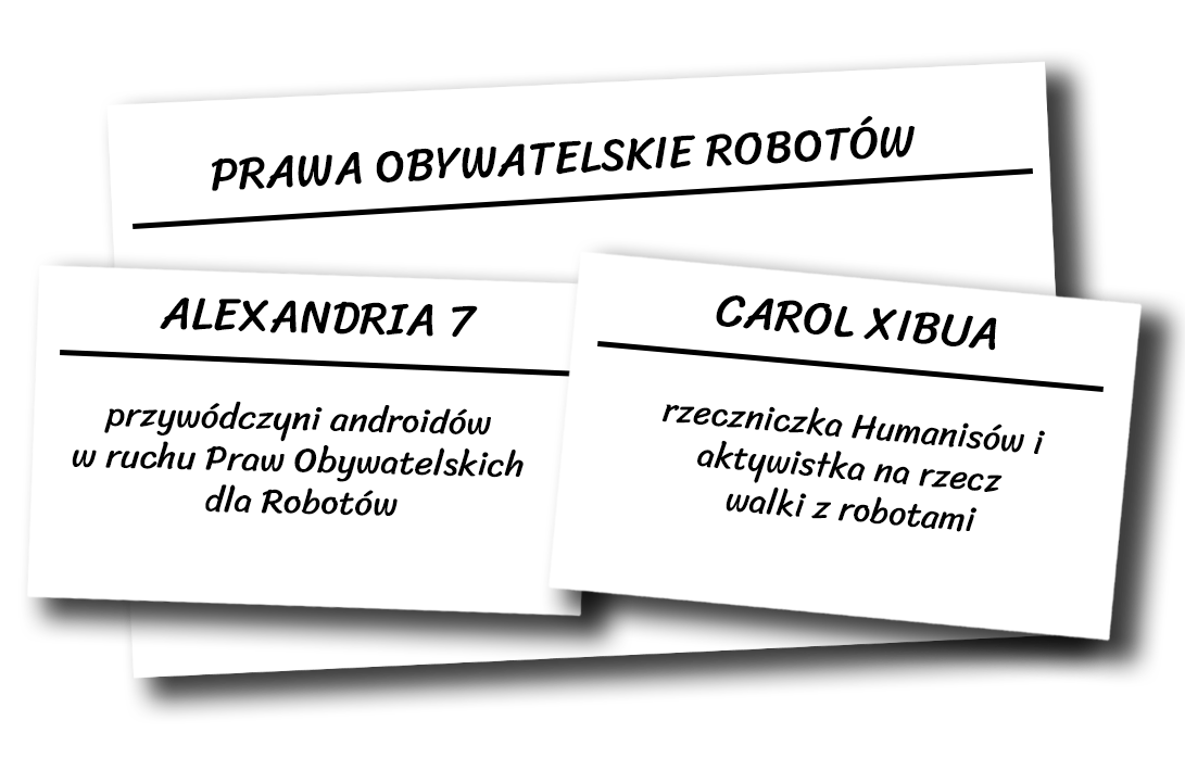Następnie poproś ich o wybór jednej z dwóch dostępnych nadchodzących komplikacji: Prawa obywatelskie robotów lub Wybory w Silicon City. Niech stworzą też jedną lub dwie persony dla wybranego problemu, uzupełniając pulę postaci swoimi pomysłami.
