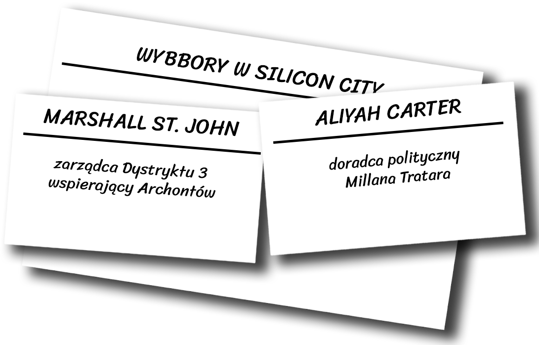 Jeżeli twoi gracze zdecydują się na Wybory w Silicon City jako nadchodzącą konsekwencję, Aliyah Carter pojawi się w siedzibie Rady, żeby porozmawiać z Archontami bezpośrednio. Millan Tratar, kandydat na stanowisko zarządcy Dystryktu 3, który uważa Archontów za “narzędzia represji”, zaginął. Jednym z jego zwyczajów są samotne spacery po osiedlach w południowych rejonach Dystryktu 3, ale ostatniej nocy nie wrócił z jednego z nich. Carter nie ma do kogo zwrócić się o pomoc. Czy ktoś związany z radnym St. Johnem porwał Tratara, żeby storpedować kampanię tego drugiego, a może Tratar nie jest taki nieskazitelny, jakby się mogło wydawać?